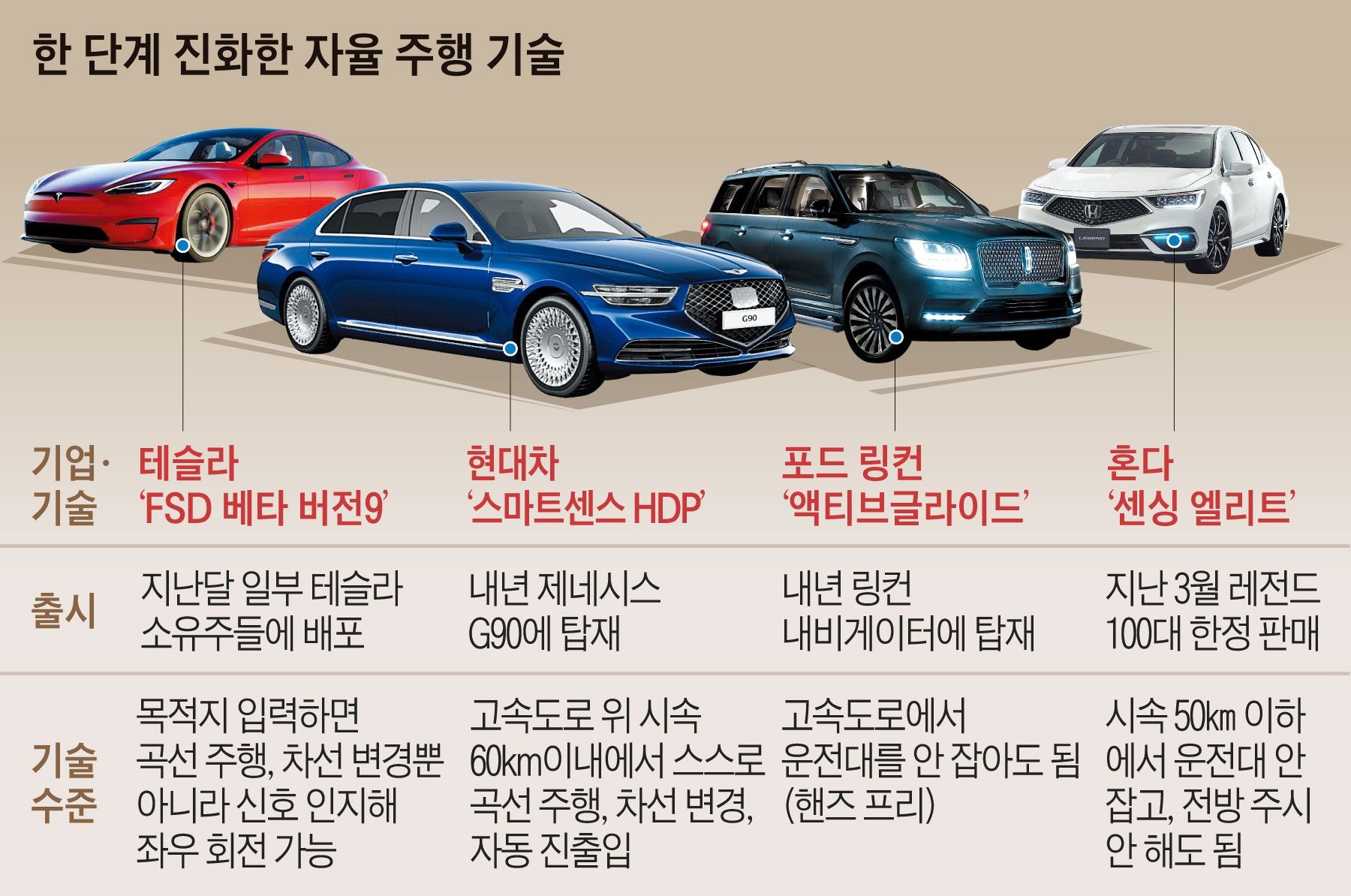 한국 역시 정부가 2026년까지 ‘레벨4 자율주행차 상용화’를 목표로 도심 주행 실증 사업을 진행하고 있습니다. 국내 시장에서는 현대자동차와 네이버랩스가 테슬라의 기술을 추격 중입니다.